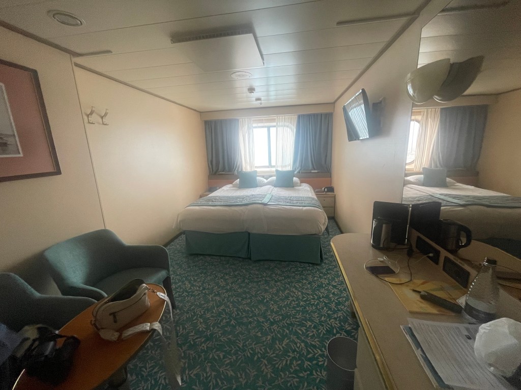 Our room was spacious, clean and we had a lovely cabin maid called Jacqui who introduced herself when we arrived. Our beds were made into two singles (we aren’t married so our names on the booking are different) but within minutes this was changed. We had paid for an outside cabin, only for the reason we need light to be able to wake up in the morning after all of those evening cocktails! The cabin had a small table and 2 chairs, a dressing area and ample storage. It was incredibly quiet (which considering we were on deck 1 was amazing). We heard nothing from the cabins either side of us for the whole trip which means unusually for cruise ships, the sound deadening was great.